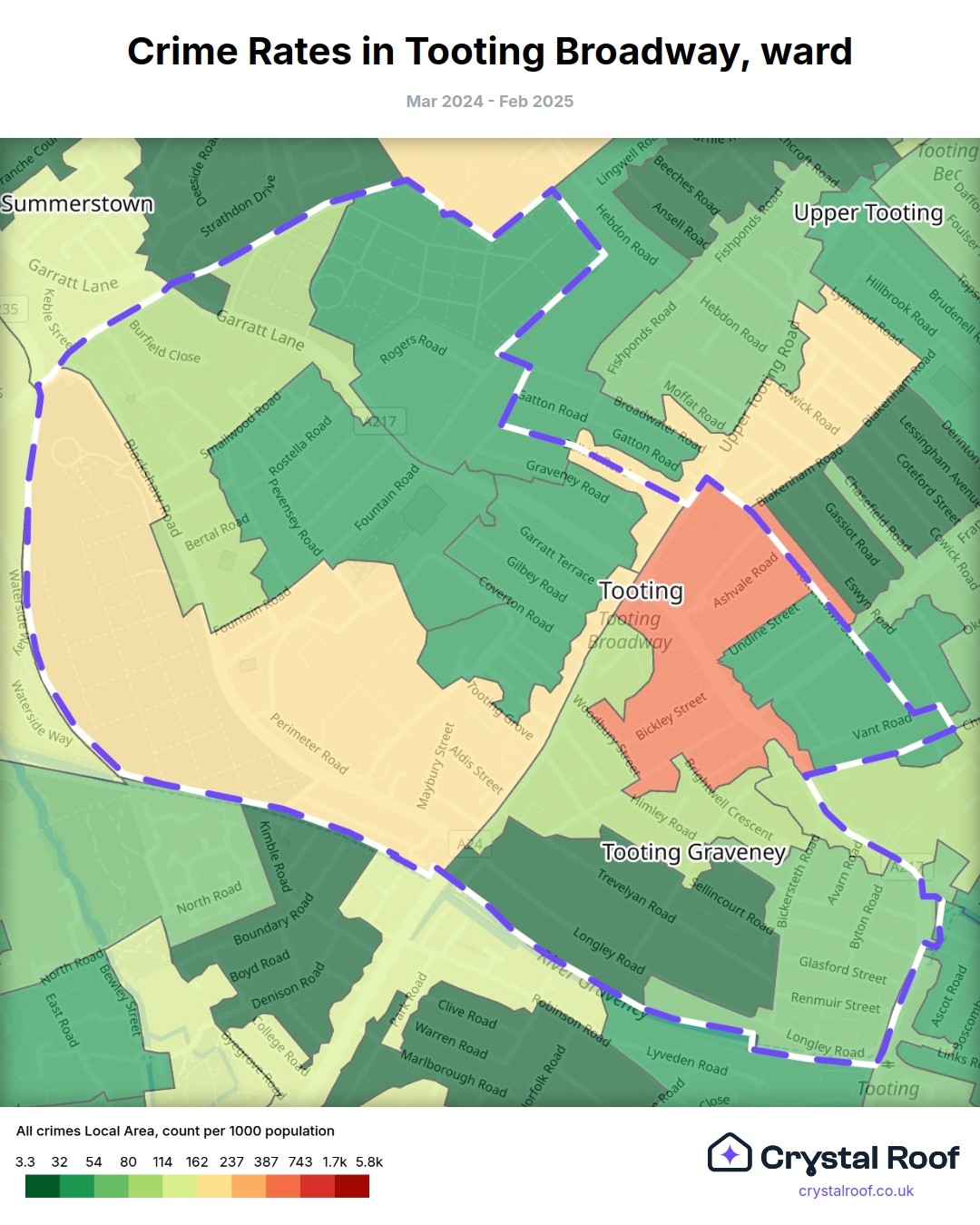 Tooting Broadway, (ward) includes areas with the following crime ratings (see map):