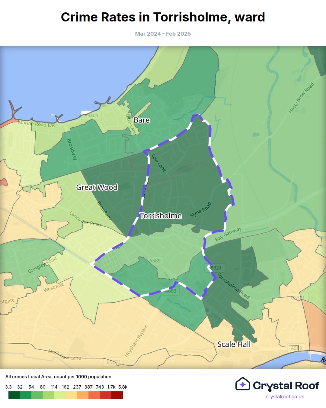 Torrisholme, (ward) includes areas with the following crime ratings (see map):