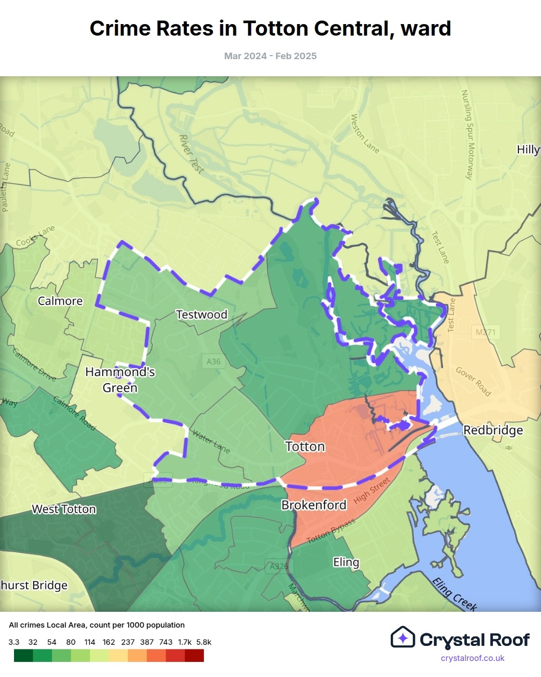 Totton Central, (ward) includes areas with the following crime ratings (see map):