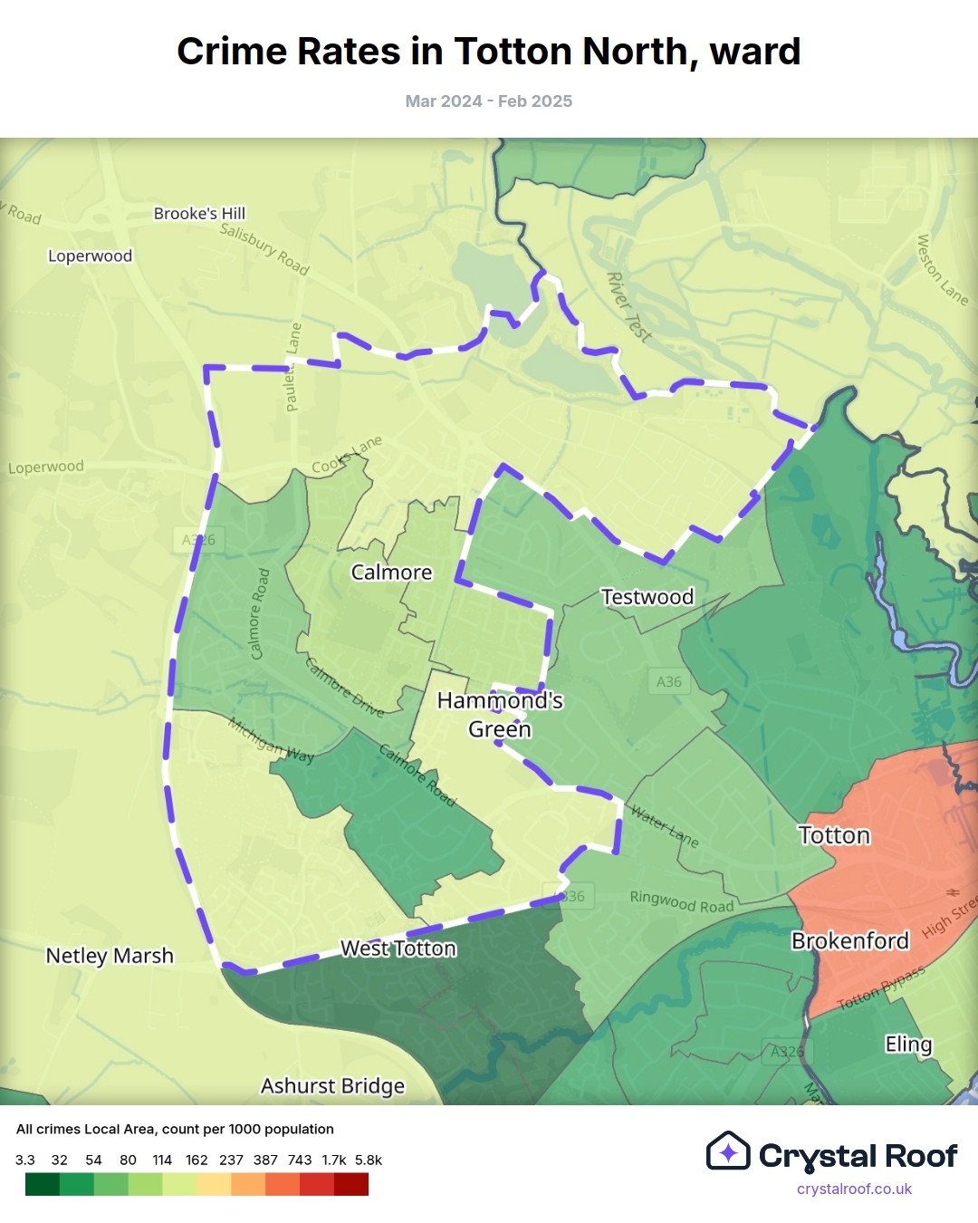 Totton North, (ward) includes areas with the following crime ratings (see map):