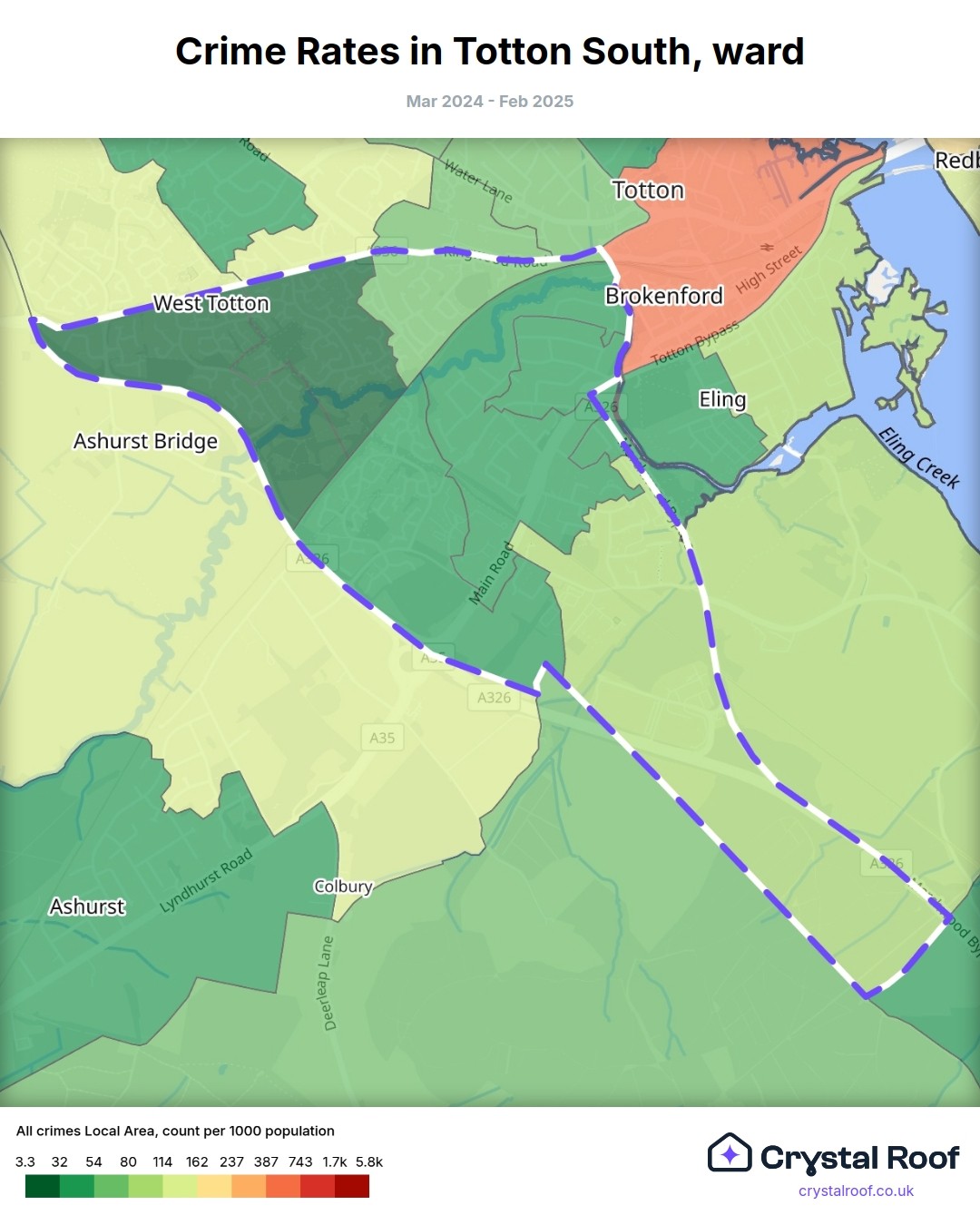 Totton South, (ward) includes areas with the following crime ratings (see map):