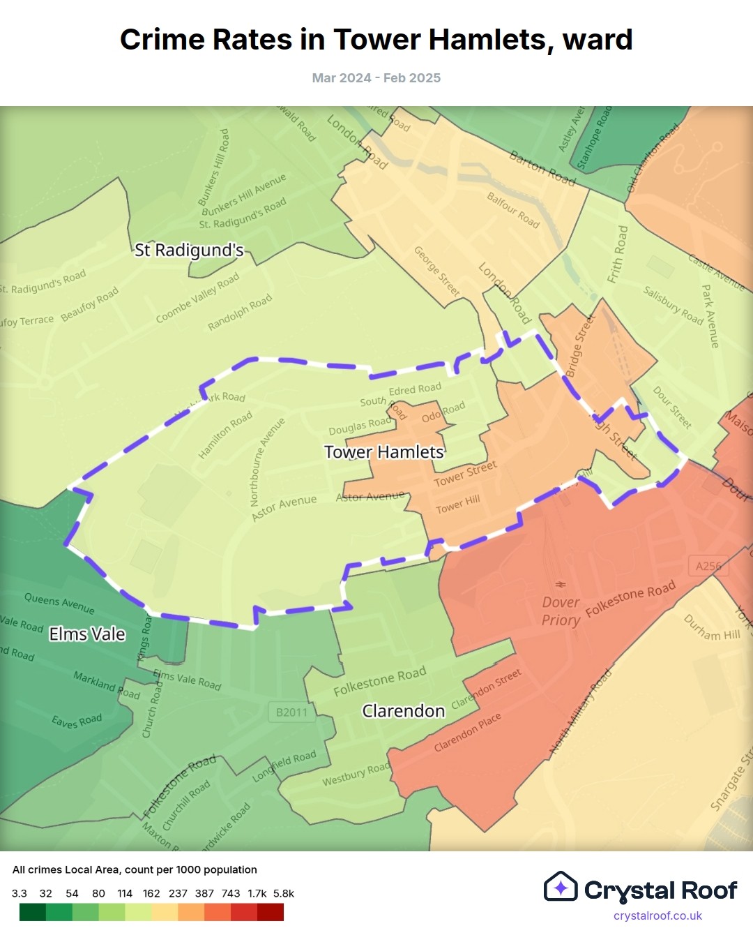 Tower Hamlets (ward) is located within Dover (borough). Annual total crime rate in Dover (borough) is 94.3 crimes per thousand resident population, which can be rated as 4 out of 10 or low crime level compared to other local authority districts in England and Wales.