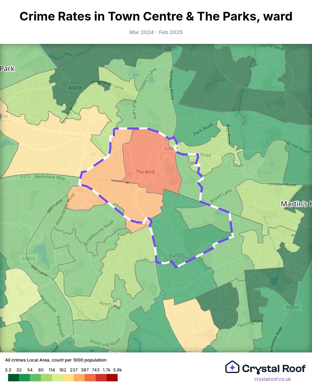Town Centre & The Parks (ward) is located within Bracknell Forest (borough). Annual total crime rate in Bracknell Forest (borough) is 68.3 crimes per thousand resident population, which can be rated as 2 out of 10 or low crime level compared to other local authority districts in England and Wales.