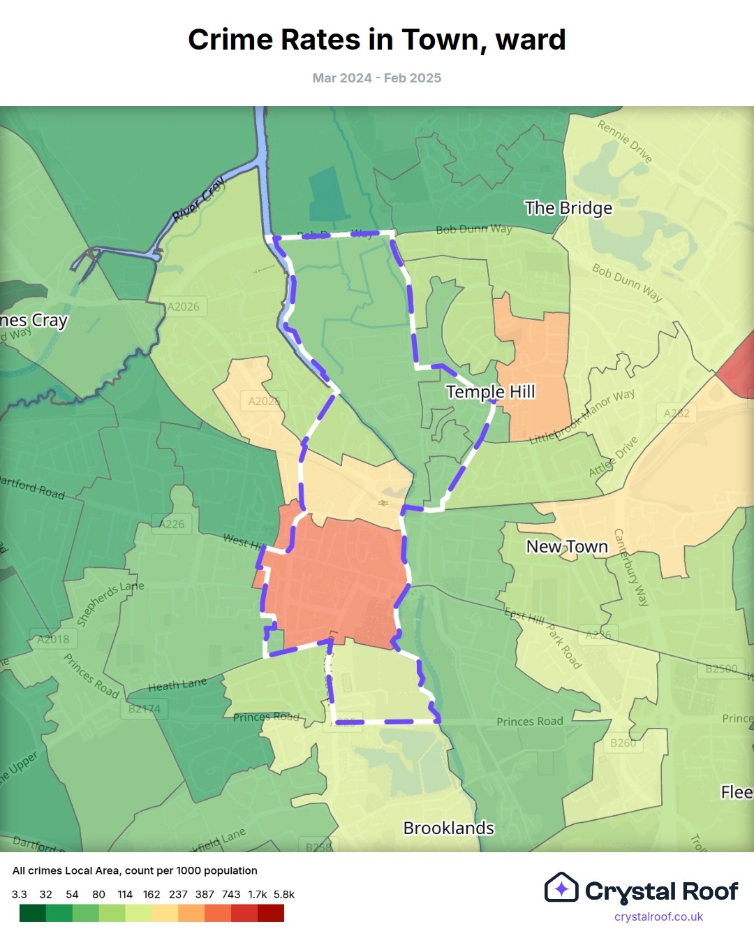 Town (ward) is located within Dartford (borough). Annual total crime rate in Dartford (borough) is 118 crimes per thousand resident population, which can be rated as 6 out of 10 or medium crime level compared to other local authority districts in England and Wales.
