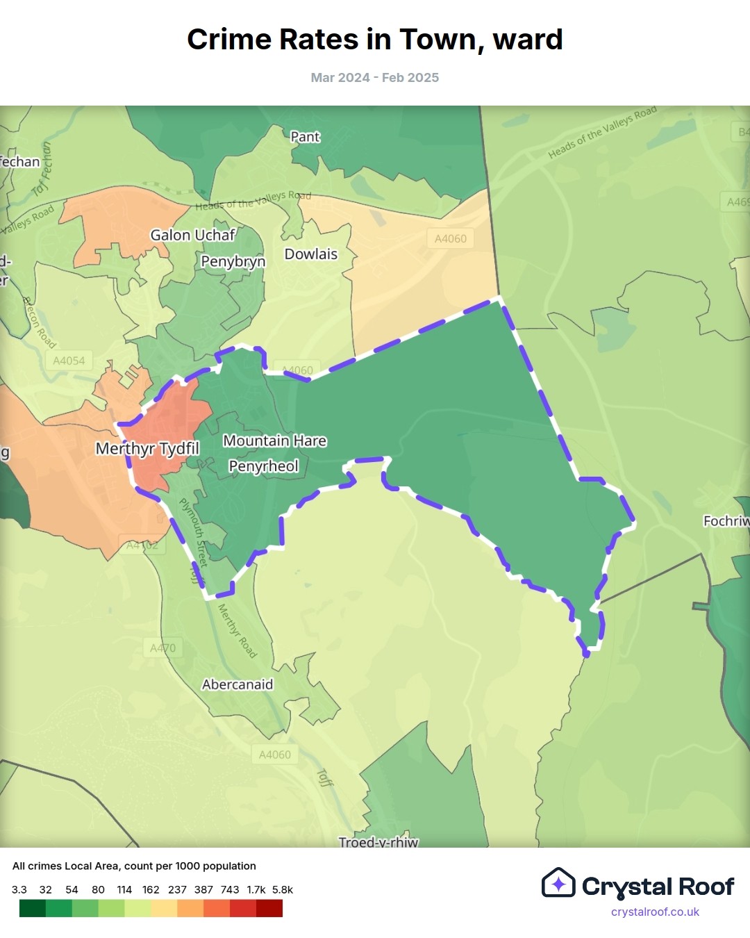 Town (ward) is located within Merthyr Tydfil (borough). Annual total crime rate in Merthyr Tydfil (borough) is 111 crimes per thousand resident population, which can be rated as 5 out of 10 or medium crime level compared to other local authority districts in England and Wales.