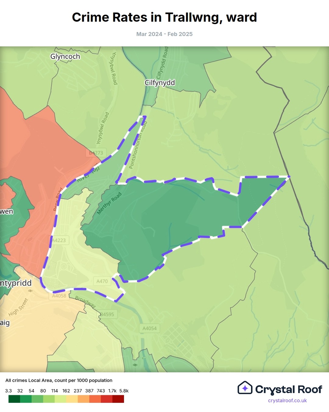 Trallwng (ward) is located within Rhondda Cynon Taf (borough). Annual total crime rate in Rhondda Cynon Taf (borough) is 89 crimes per thousand resident population, which can be rated as 4 out of 10 or low crime level compared to other local authority districts in England and Wales.