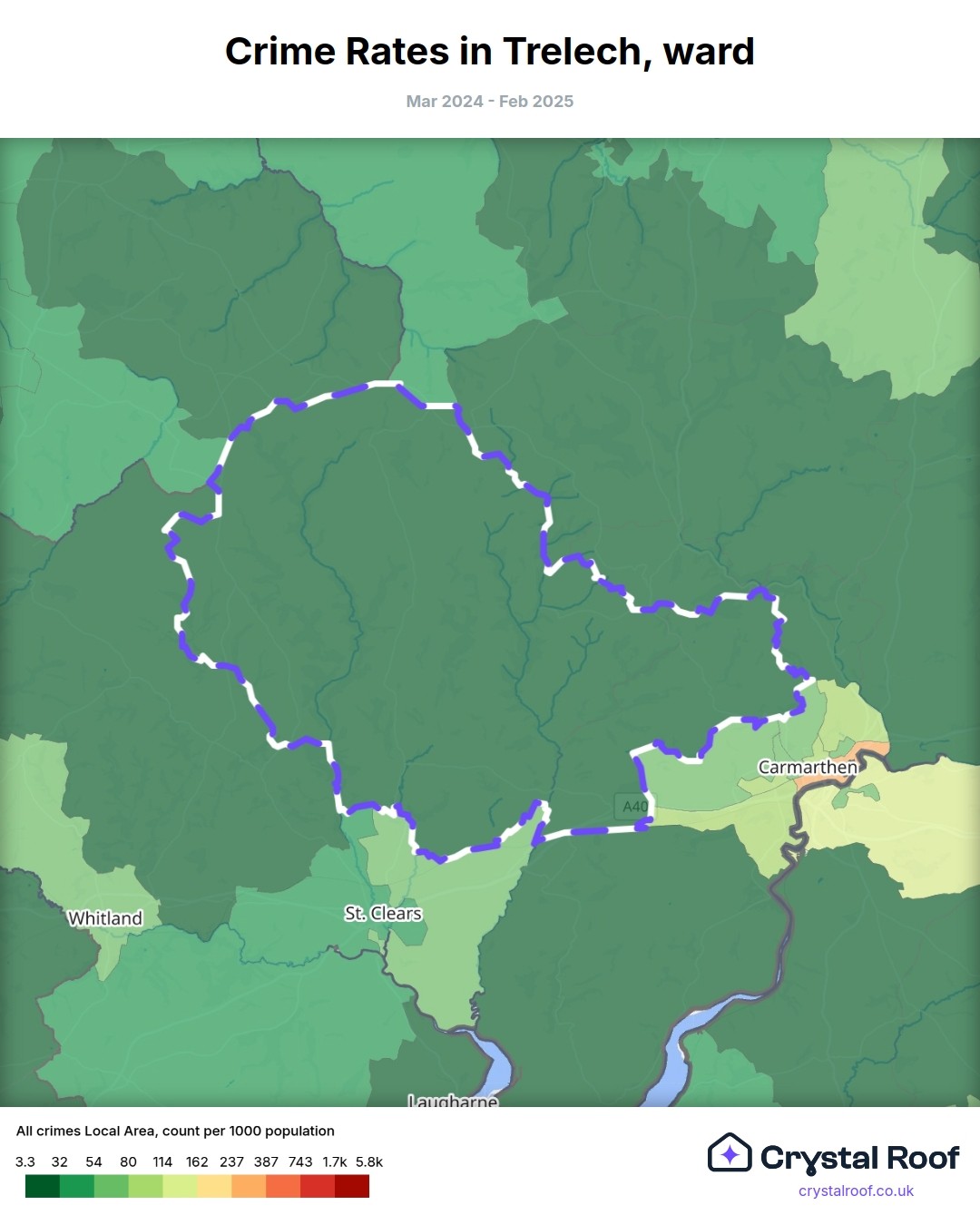 Trelech, (ward) includes areas with the following crime ratings (see map):