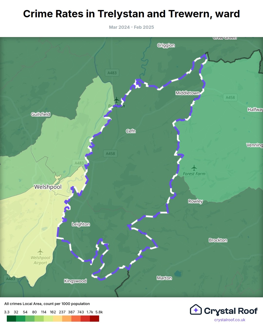Trelystan and Trewern, (ward) includes areas with the following crime ratings (see map):