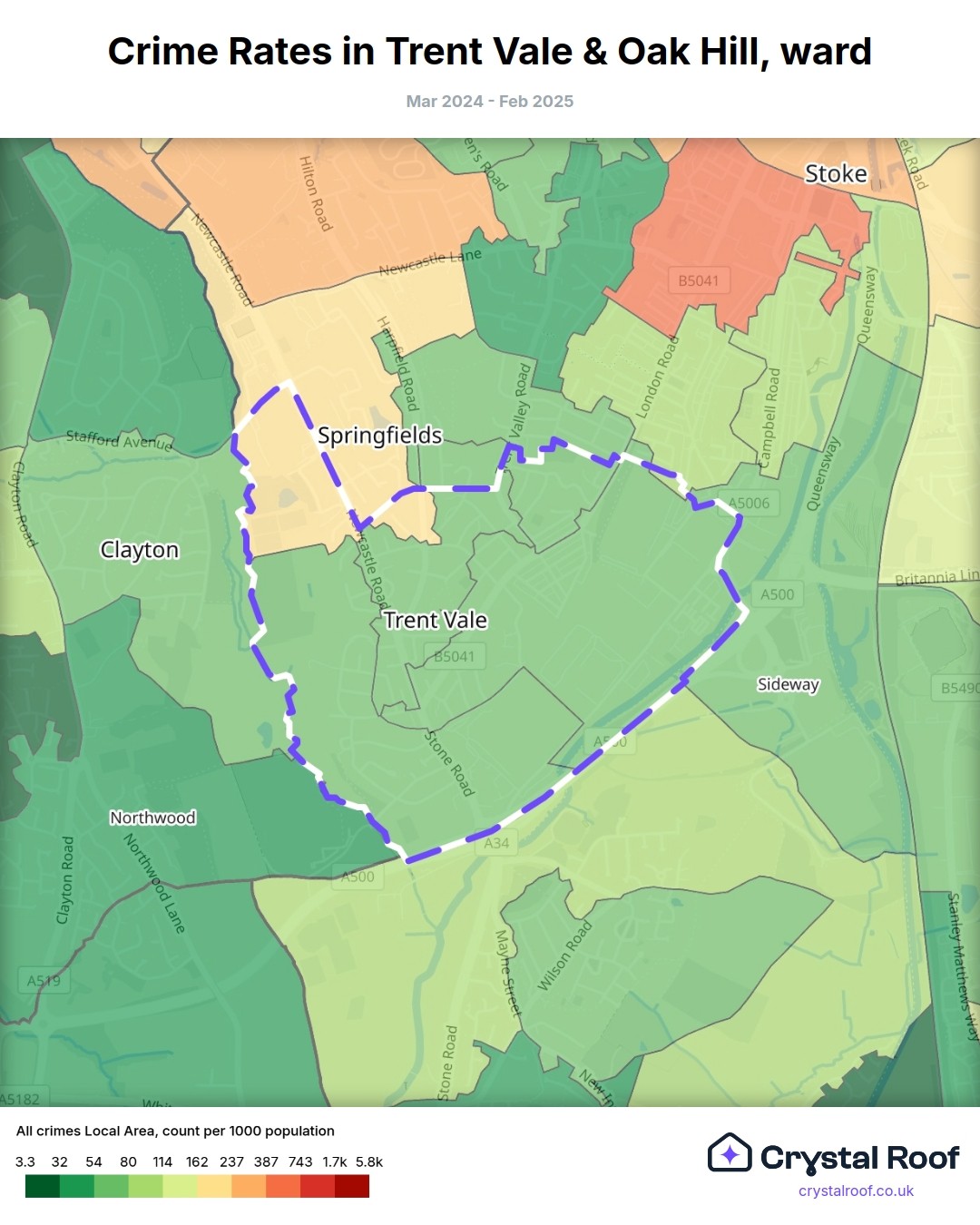 Trent Vale & Oak Hill, (ward) includes areas with the following crime ratings (see map):
