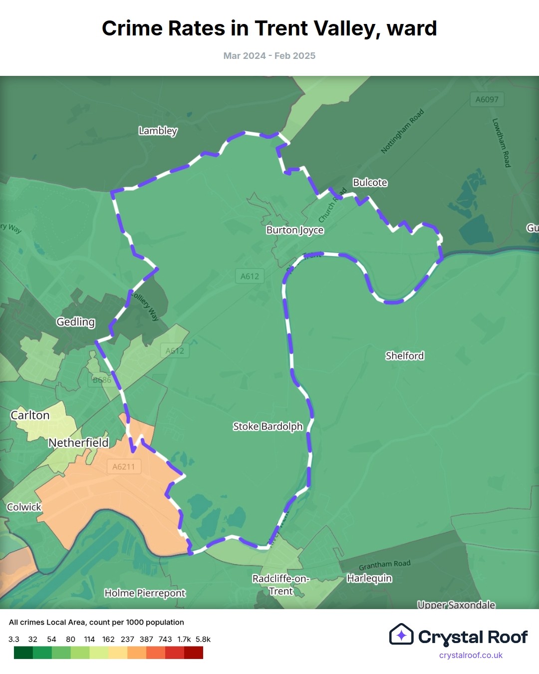 Trent Valley, (ward) includes areas with the following crime ratings (see map):