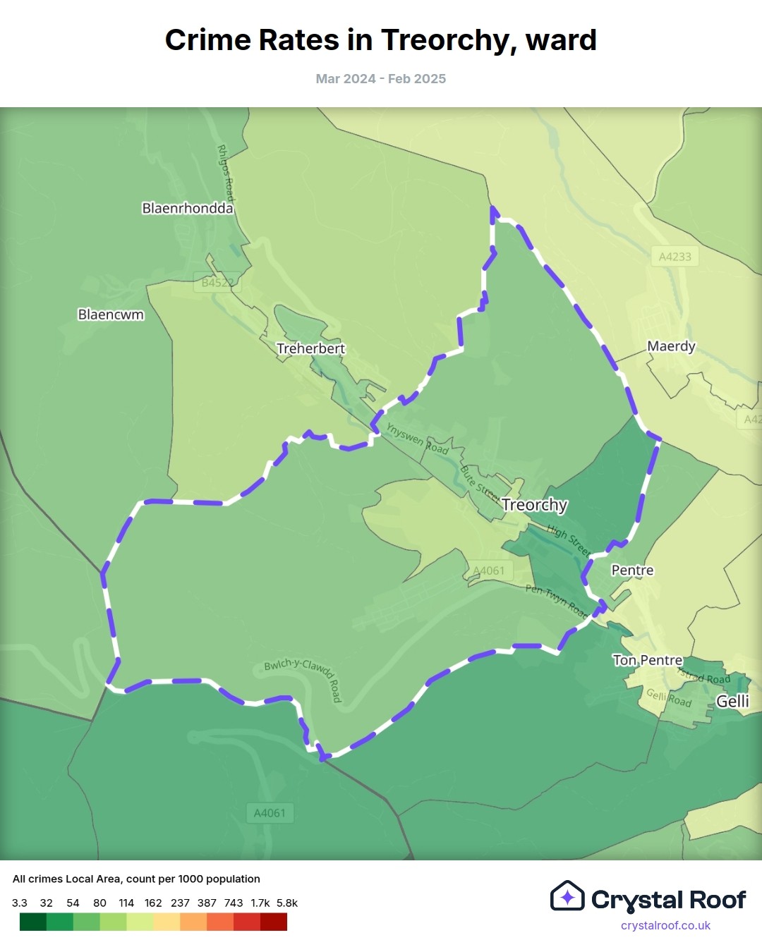 The figures in grey indicate the relative ratings of Treorchy (ward) for a specific crime type compared to other wards in England and Wales.