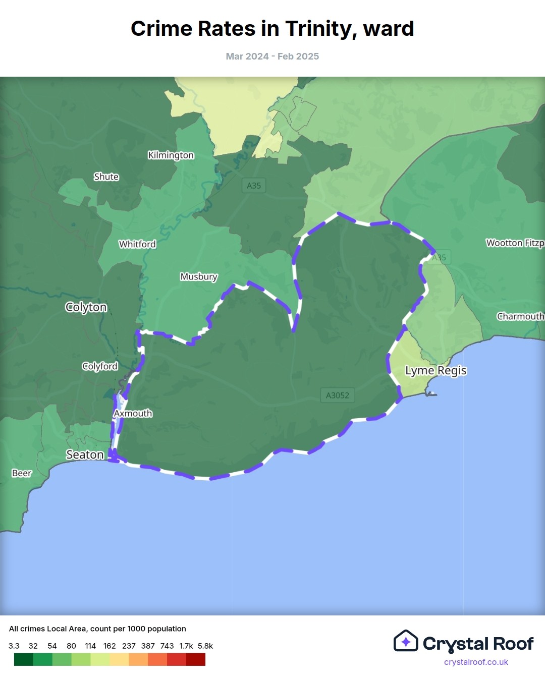 Trinity (ward) is located within East Devon (borough). Annual total crime rate in East Devon (borough) is 51.1 crimes per thousand resident population, which can be rated as 1 out of 10 or low crime level compared to other local authority districts in England and Wales.