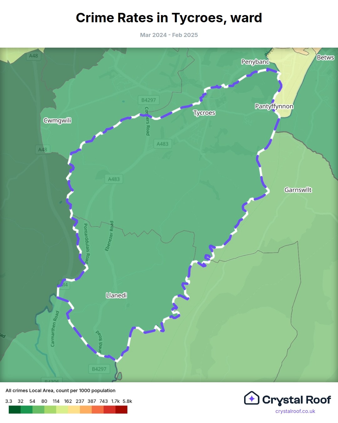 Tycroes, (ward) includes areas with the following crime ratings (see map):