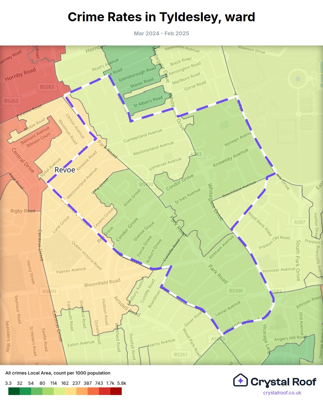 Tyldesley (ward) is located within Blackpool (borough). Annual total crime rate in Blackpool (borough) is 216 crimes per thousand resident population, which can be rated as 8 out of 10 or high crime level compared to other local authority districts in England and Wales.