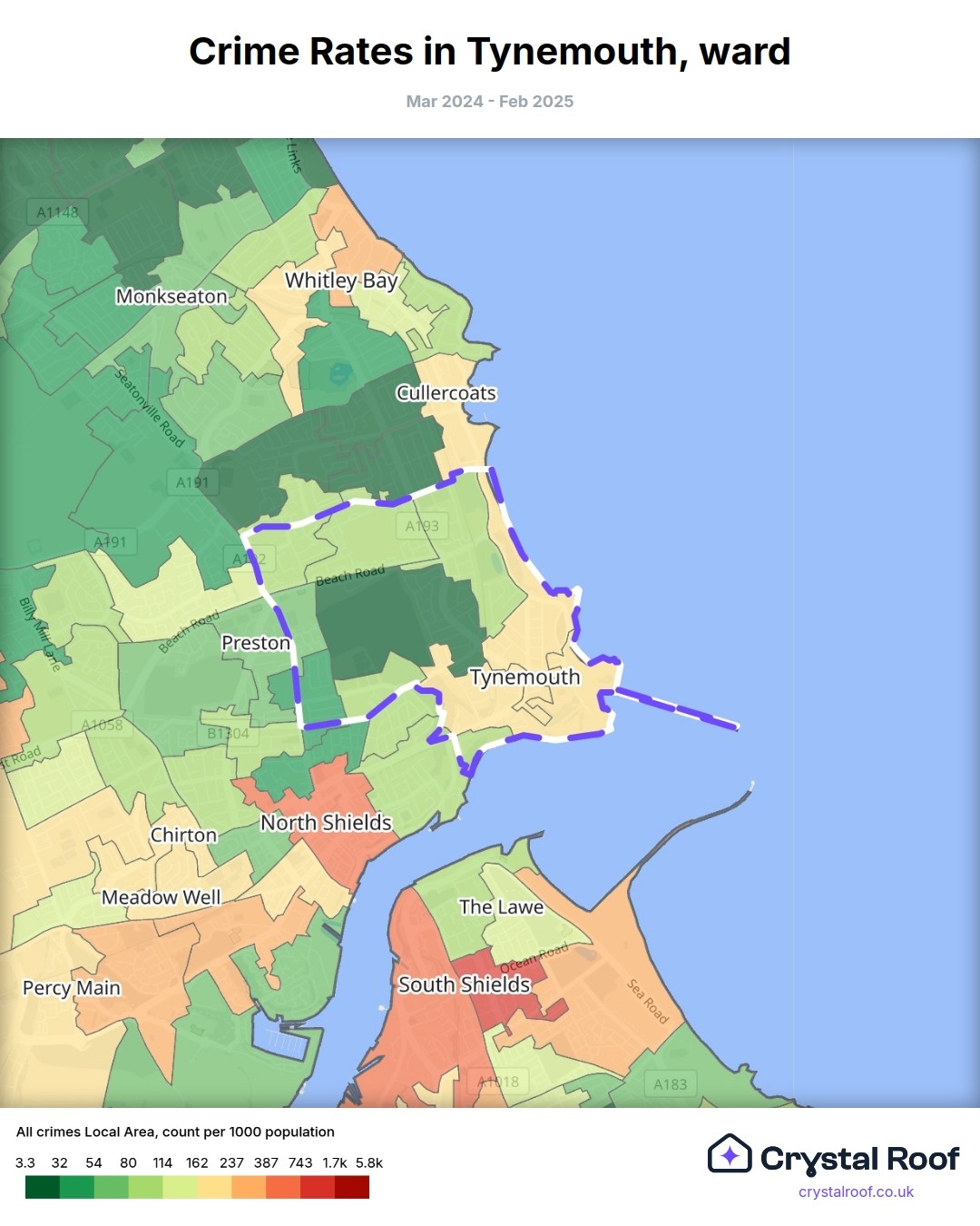 Tynemouth, (ward) includes areas with the following crime ratings (see map):