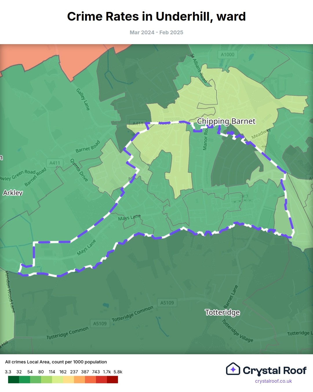Underhill (ward) is located within Barnet (borough). Annual total crime rate in Barnet (borough) is 92.3 crimes per thousand resident population, which can be rated as 4 out of 10 or low crime level compared to other local authority districts in England and Wales.