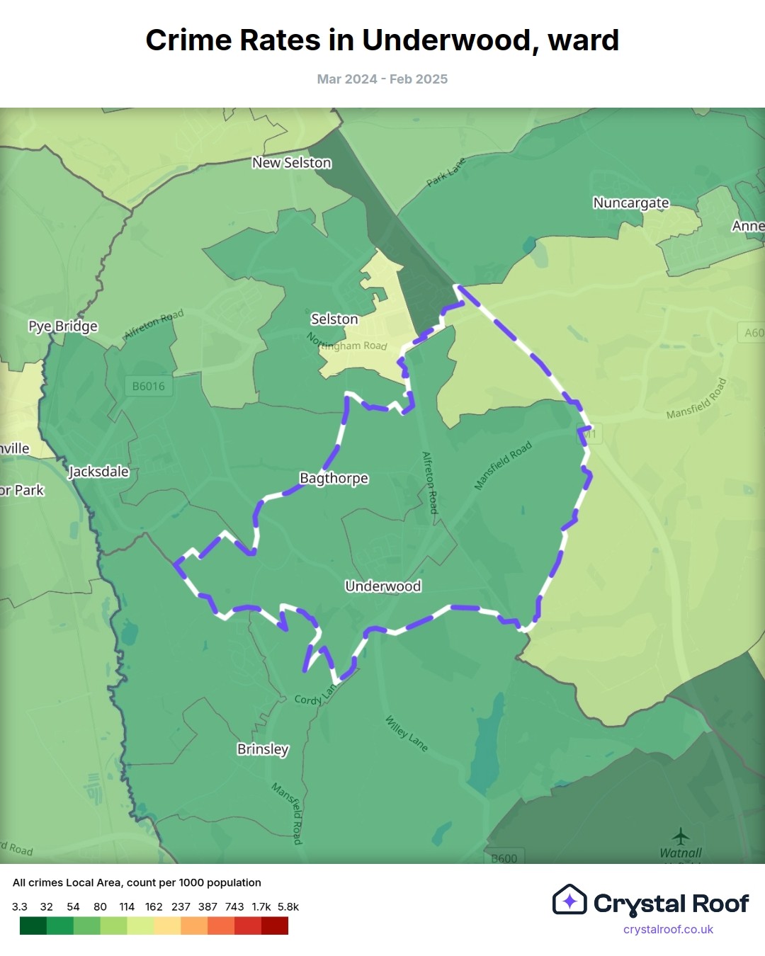 Underwood (ward) is located within Ashfield (borough). Annual total crime rate in Ashfield (borough) is 98.7 crimes per thousand resident population, which can be rated as 4 out of 10 or low crime level compared to other local authority districts in England and Wales.