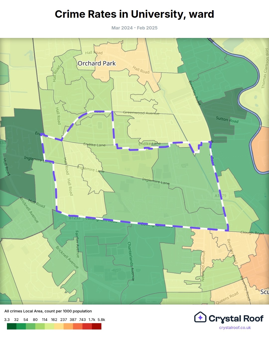 The figures in grey indicate the relative ratings of University (ward) for a specific crime type compared to other wards in England and Wales.