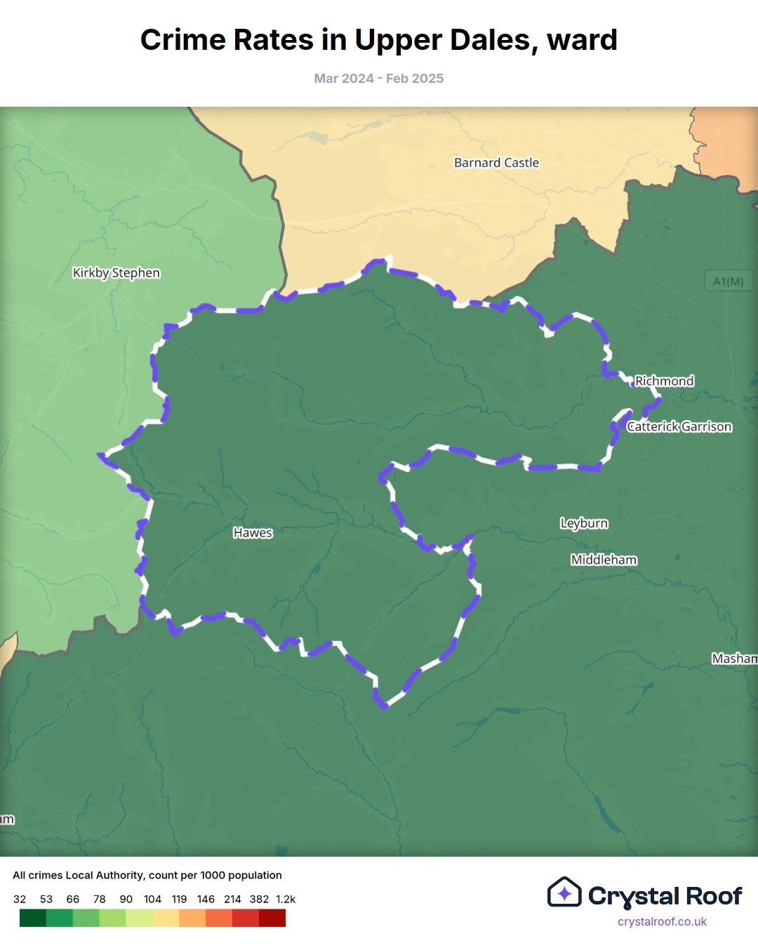 Upper Dales (ward) is located within North Yorkshire (borough). Annual total crime rate in North Yorkshire (borough) is 48.6 crimes per thousand resident population, which can be rated as 1 out of 10 or low crime level compared to other local authority districts in England and Wales.