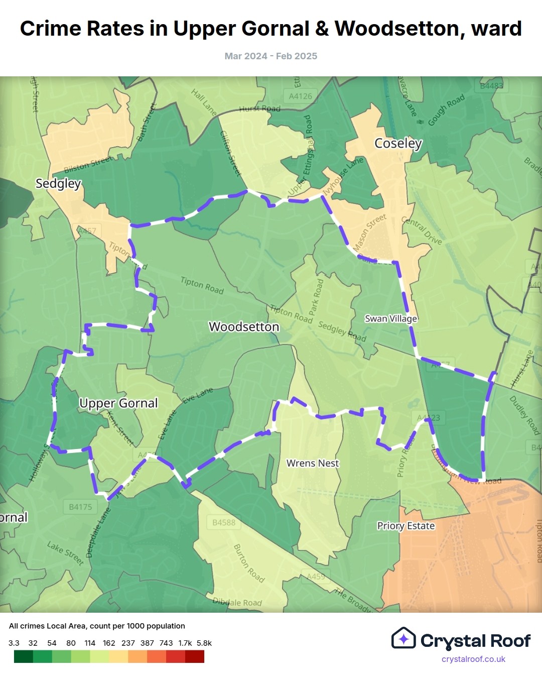 Upper Gornal & Woodsetton, (ward) includes areas with the following crime ratings (see map):