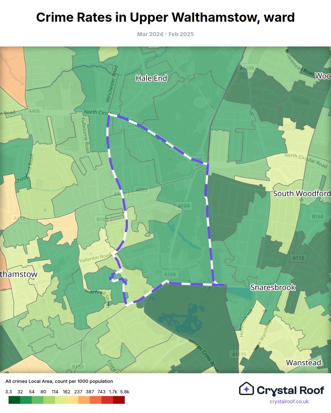 Upper Walthamstow, (ward) includes areas with the following crime ratings (see map):