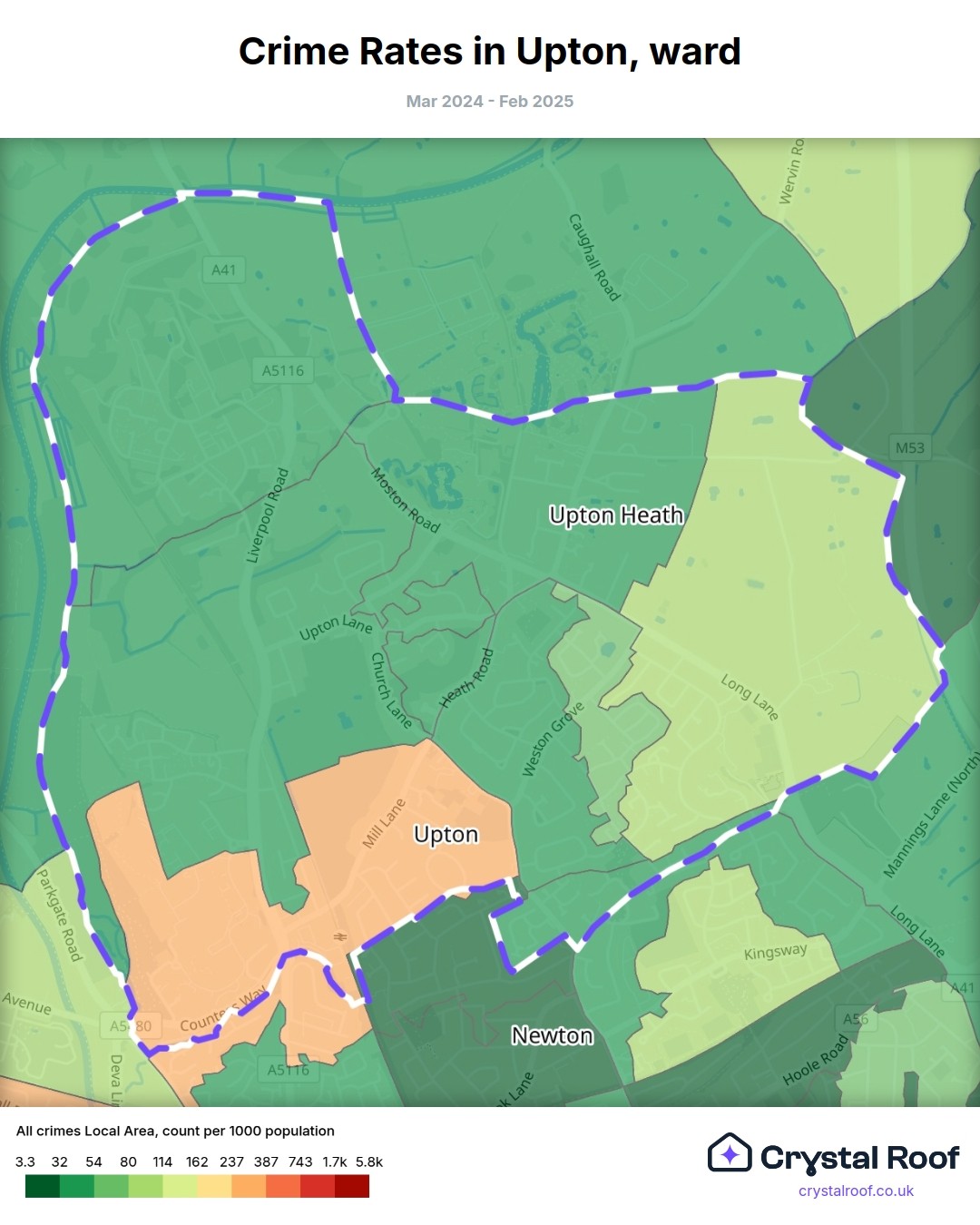 Upton (ward) is located within Cheshire West and Chester (borough). Annual total crime rate in Cheshire West and Chester (borough) is 69.3 crimes per thousand resident population, which can be rated as 2 out of 10 or low crime level compared to other local authority districts in England and Wales.