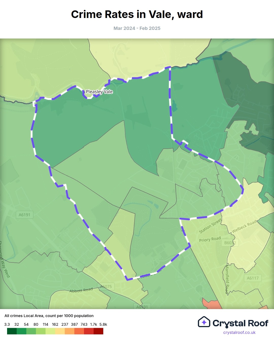 Vale (ward) is located within Mansfield (borough). Annual total crime rate in Mansfield (borough) is 115 crimes per thousand resident population, which can be rated as 6 out of 10 or medium crime level compared to other local authority districts in England and Wales.