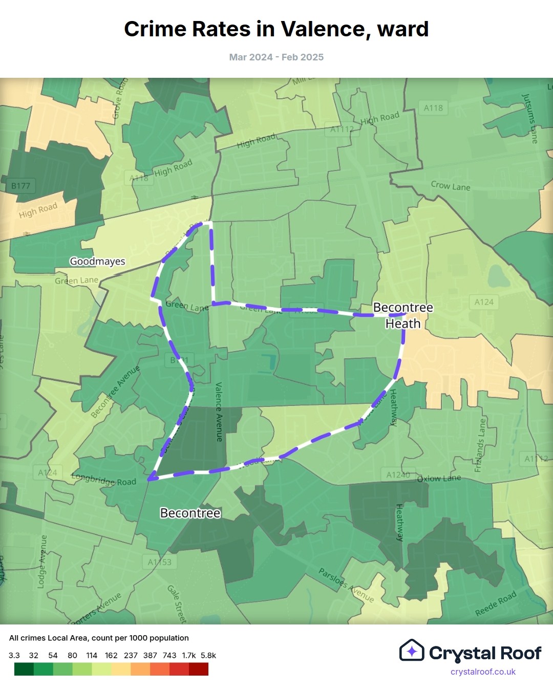 Valence (ward) is located within Barking and Dagenham (borough). Annual total crime rate in Barking and Dagenham (borough) is 111 crimes per thousand resident population, which can be rated as 5 out of 10 or medium crime level compared to other local authority districts in England and Wales.