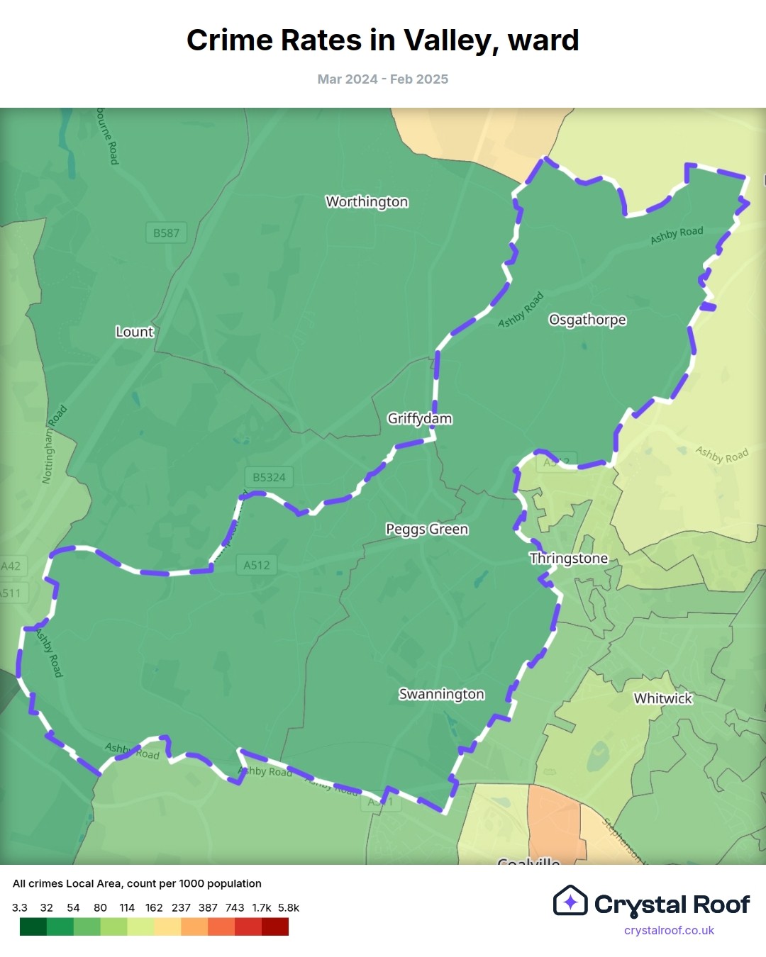 Valley (ward) is located within North West Leicestershire (borough). Annual total crime rate in North West Leicestershire (borough) is 78.6 crimes per thousand resident population, which can be rated as 3 out of 10 or low crime level compared to other local authority districts in England and Wales.