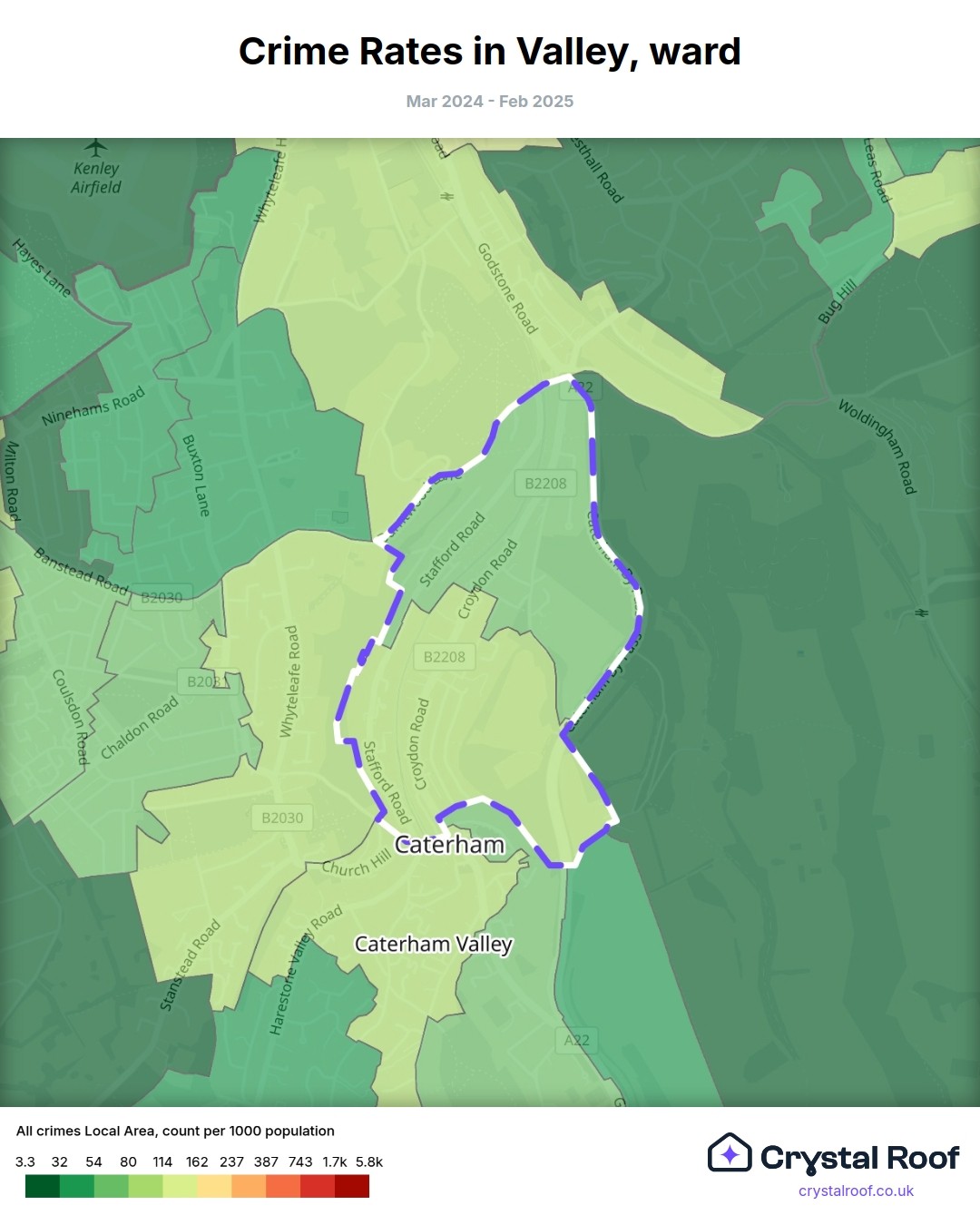 Valley (ward) is located within Tandridge (borough). Annual total crime rate in Tandridge (borough) is 70.9 crimes per thousand resident population, which can be rated as 2 out of 10 or low crime level compared to other local authority districts in England and Wales.