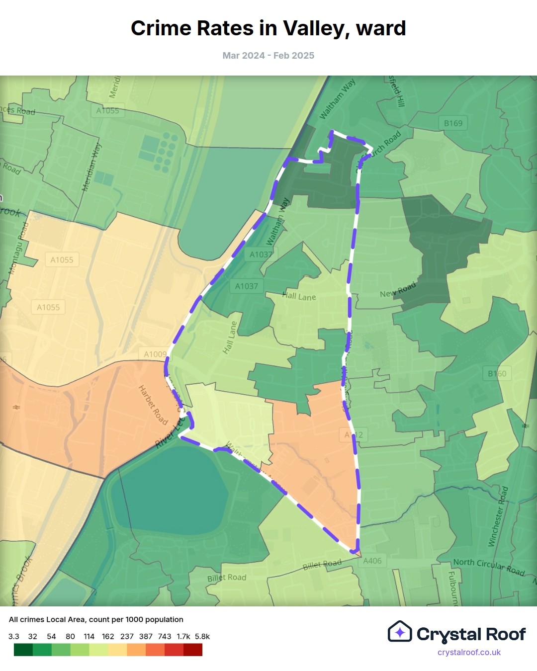 Valley (ward) is located within Waltham Forest (borough). Annual total crime rate in Waltham Forest (borough) is 110 crimes per thousand resident population, which can be rated as 5 out of 10 or medium crime level compared to other local authority districts in England and Wales.