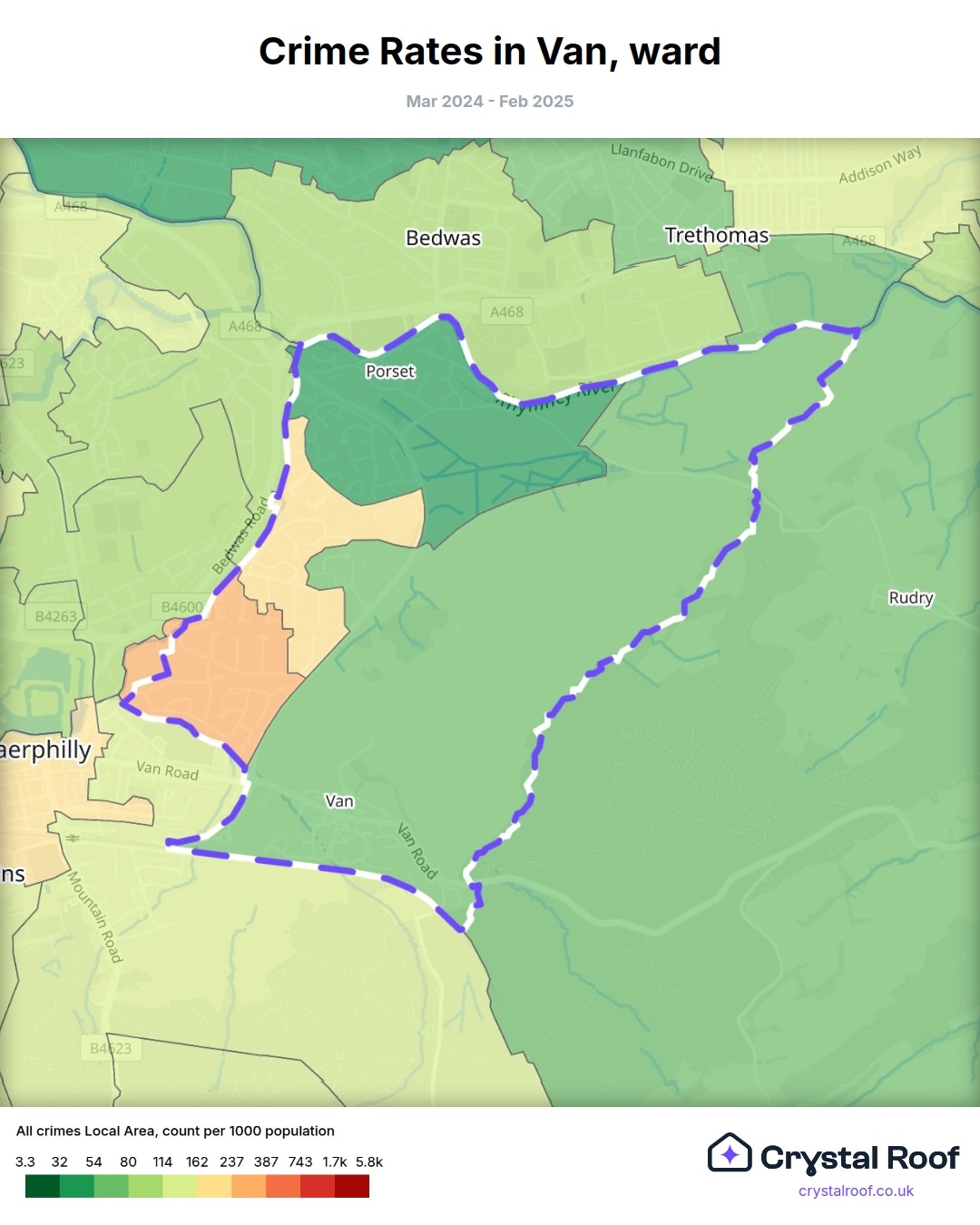 Van (ward) is located within Caerphilly (borough). Annual total crime rate in Caerphilly (borough) is 89.9 crimes per thousand resident population, which can be rated as 4 out of 10 or low crime level compared to other local authority districts in England and Wales.