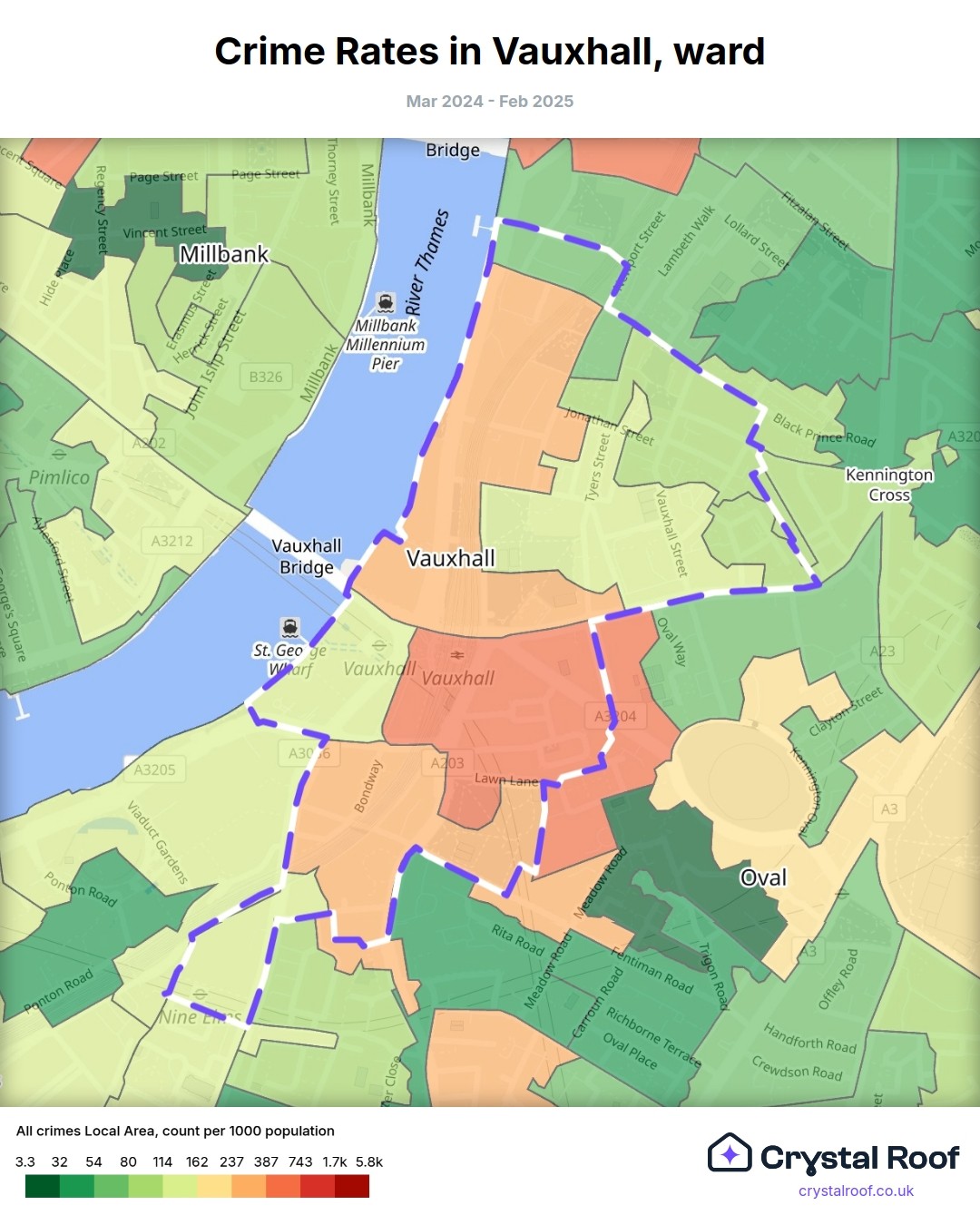 Vauxhall, (ward) includes areas with the following crime ratings (see map):