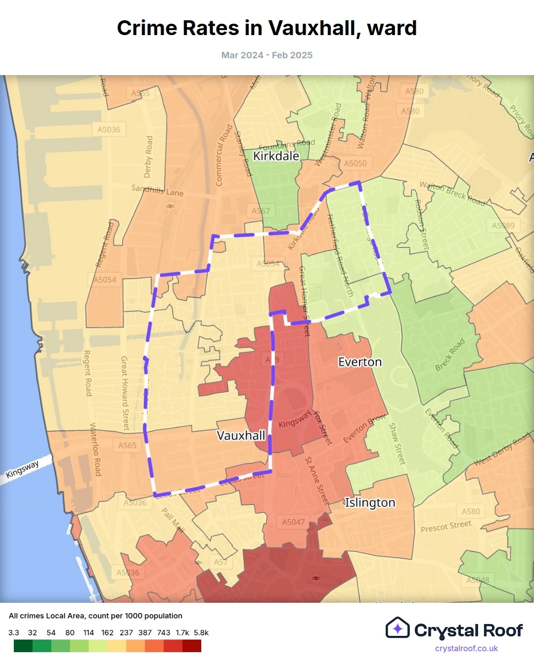 Vauxhall (ward) is located within Liverpool (borough). Annual total crime rate in Liverpool (borough) is 141 crimes per thousand resident population, which can be rated as 7 out of 10 or high crime level compared to other local authority districts in England and Wales.