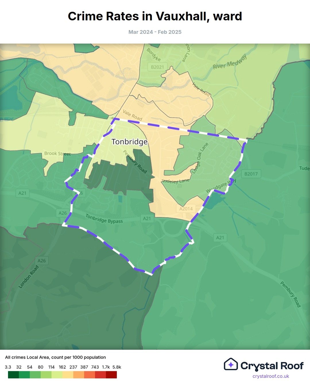 Vauxhall (ward) is located within Tonbridge and Malling (borough). Annual total crime rate in Tonbridge and Malling (borough) is 69 crimes per thousand resident population, which can be rated as 2 out of 10 or low crime level compared to other local authority districts in England and Wales.