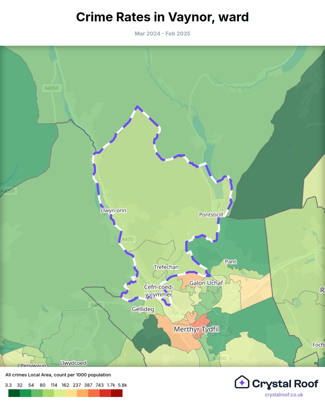 Vaynor, (ward) includes areas with the following crime ratings (see map):