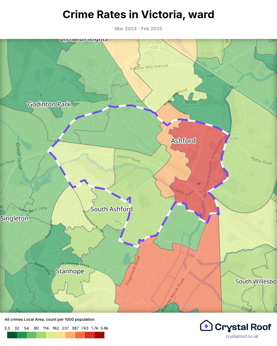 Victoria (ward) is located within Ashford (borough). Annual total crime rate in Ashford (borough) is 82.8 crimes per thousand resident population, which can be rated as 3 out of 10 or low crime level compared to other local authority districts in England and Wales.