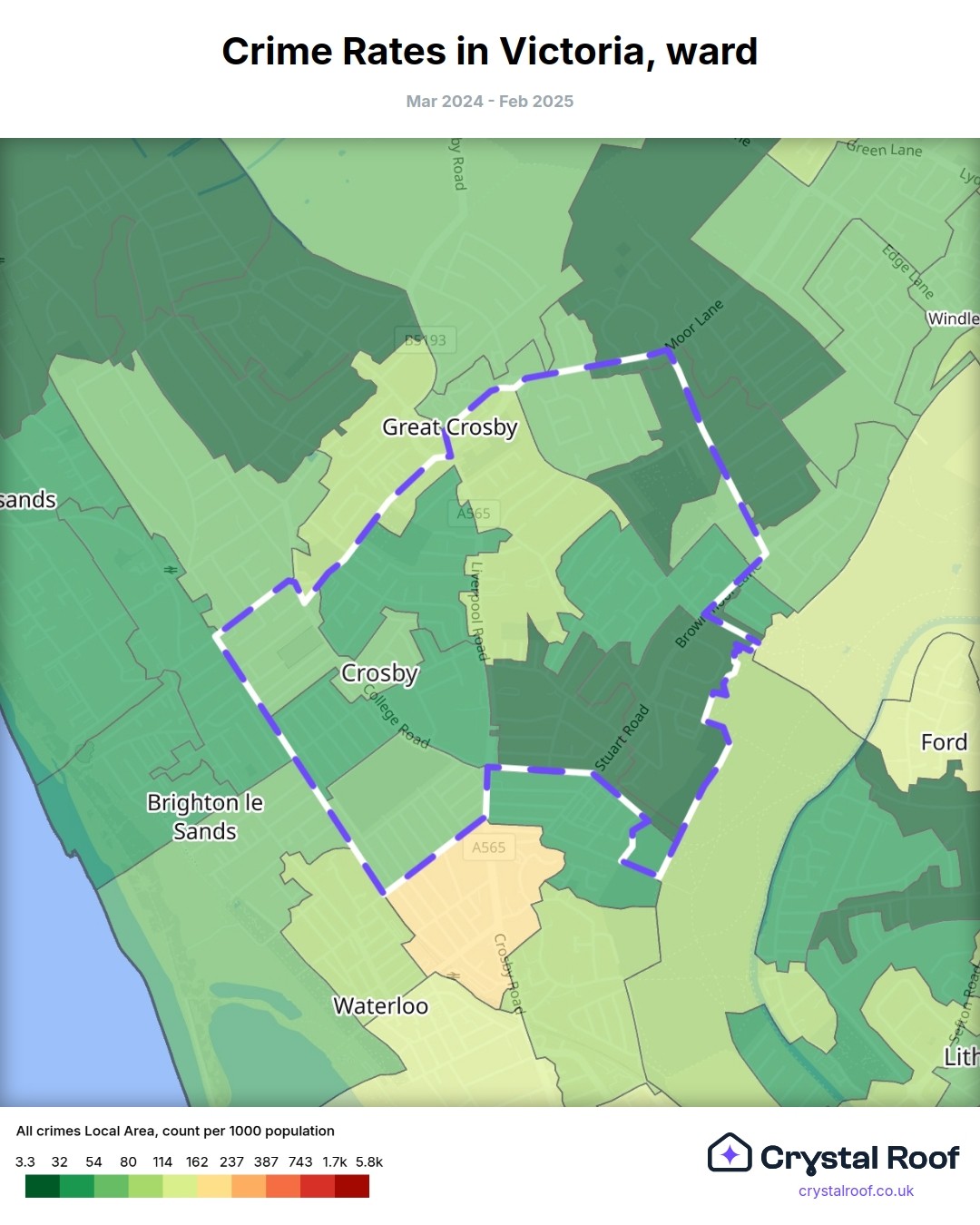 Victoria (ward) is located within Sefton (borough). Annual total crime rate in Sefton (borough) is 86.3 crimes per thousand resident population, which can be rated as 4 out of 10 or low crime level compared to other local authority districts in England and Wales.