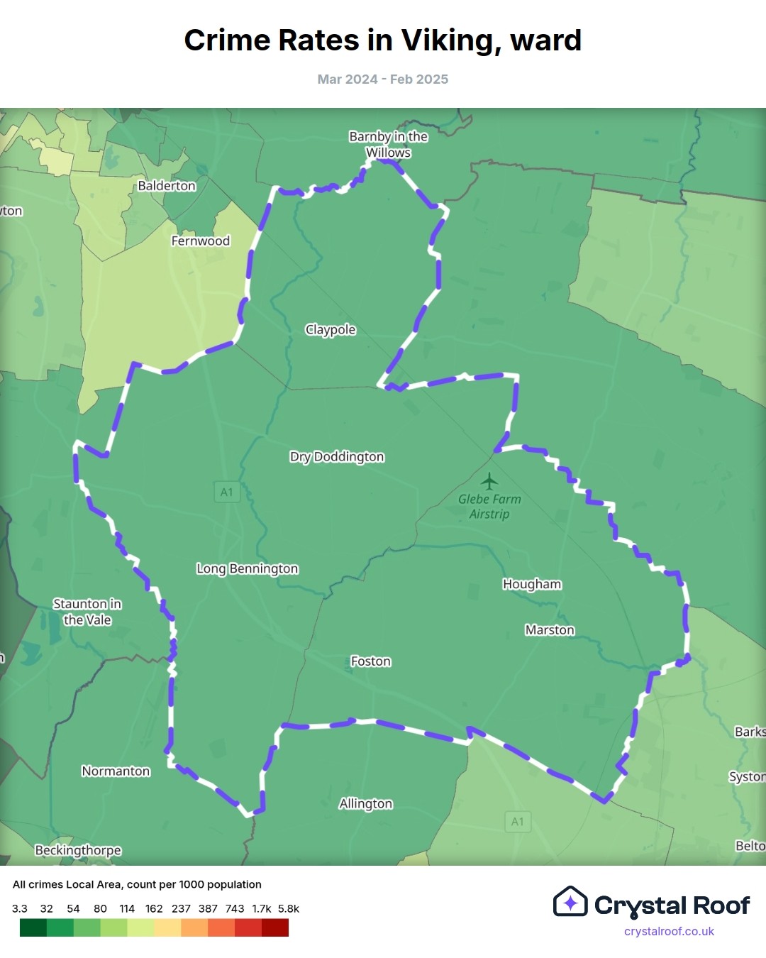 Viking (ward) is located within South Kesteven (borough). Annual total crime rate in South Kesteven (borough) is 70.9 crimes per thousand resident population, which can be rated as 2 out of 10 or low crime level compared to other local authority districts in England and Wales.