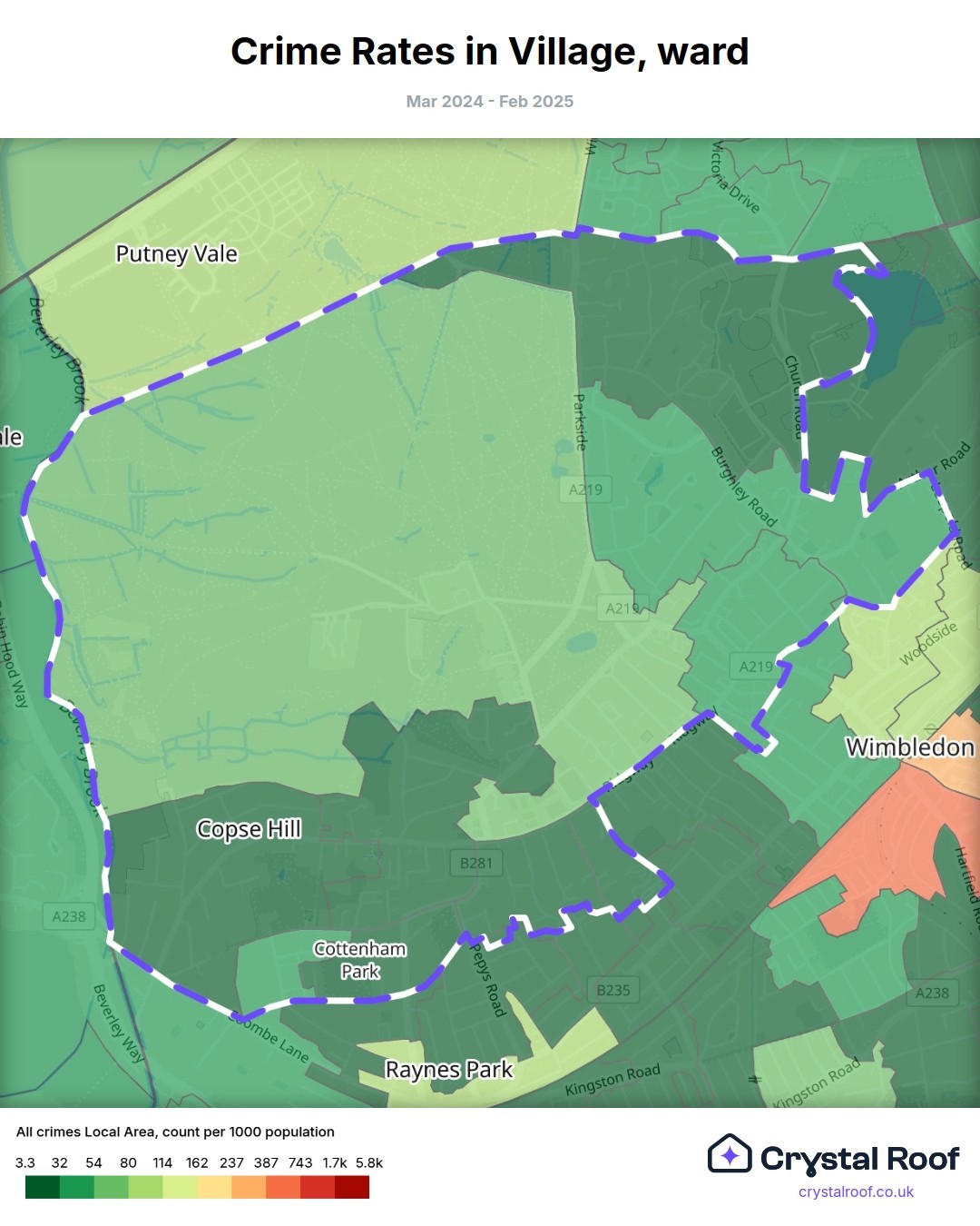 Village (ward) is located within Merton (borough). Annual total crime rate in Merton (borough) is 79.7 crimes per thousand resident population, which can be rated as 3 out of 10 or low crime level compared to other local authority districts in England and Wales.
