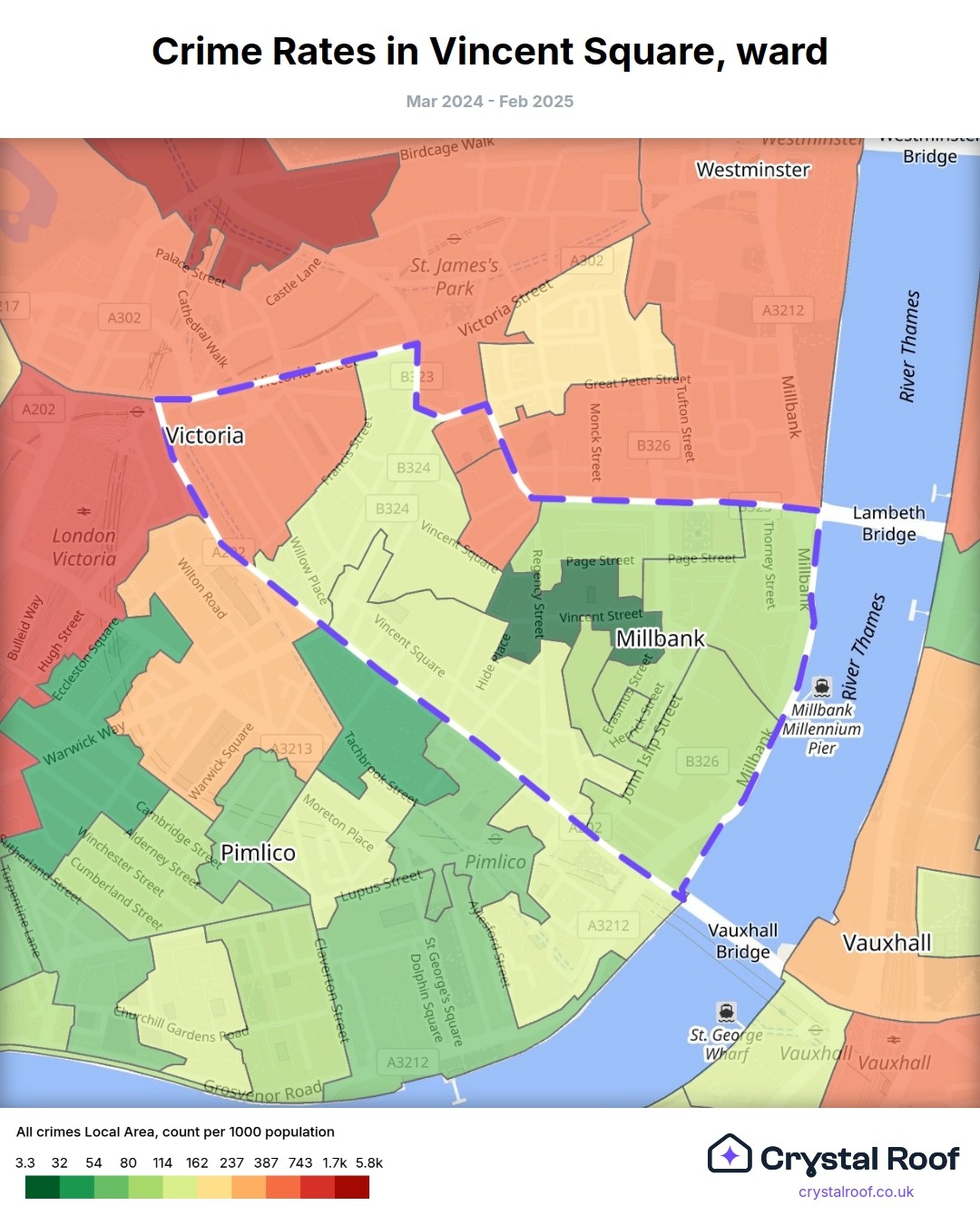 Vincent Square, (ward) includes areas with the following crime ratings (see map):