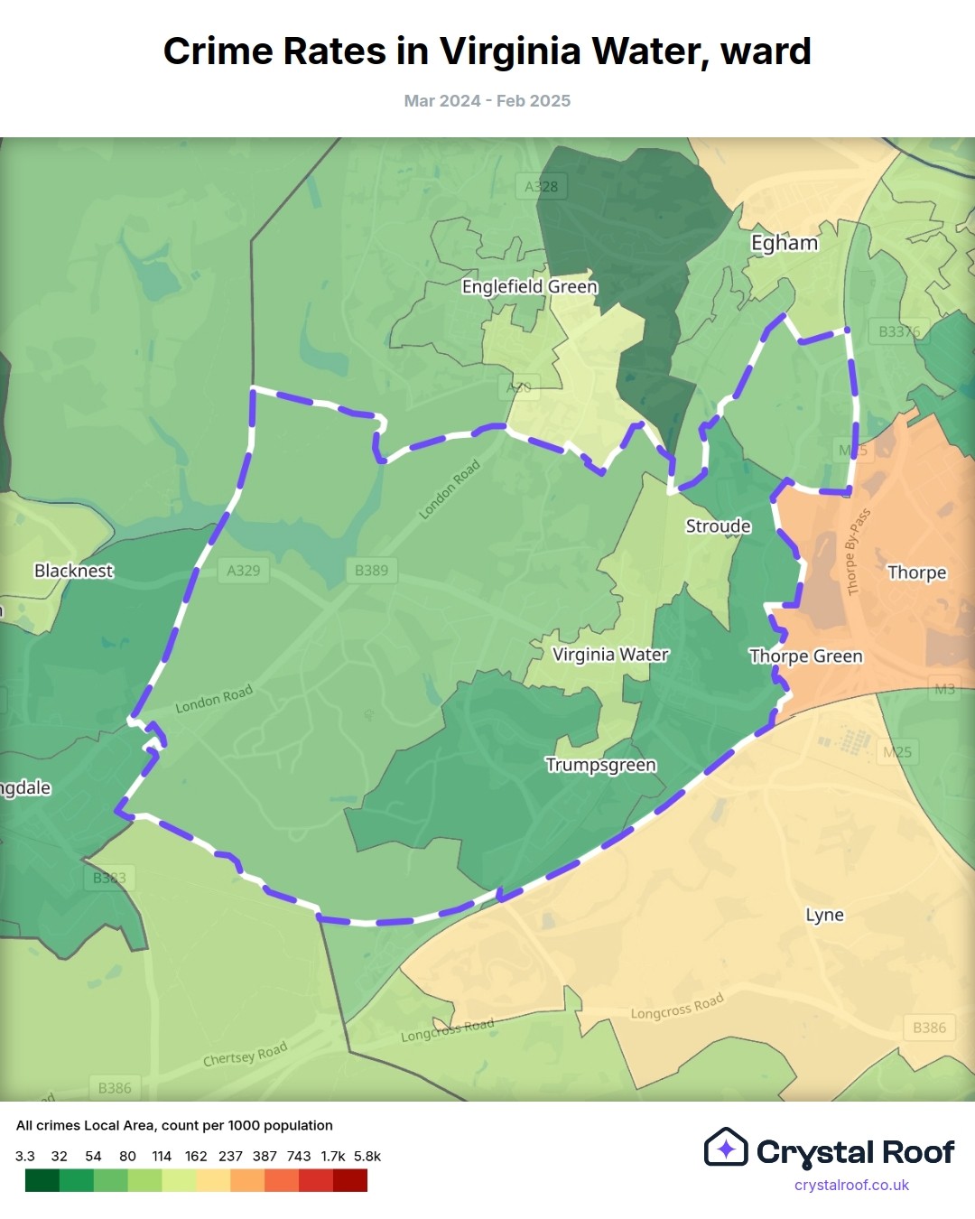 Virginia Water, (ward) includes areas with the following crime ratings (see map):