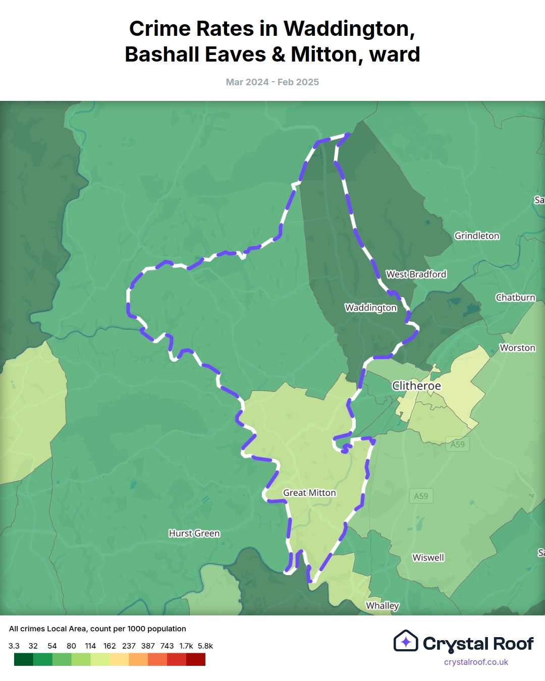 Waddington, Bashall Eaves & Mitton, (ward) includes areas with the following crime ratings (see map):