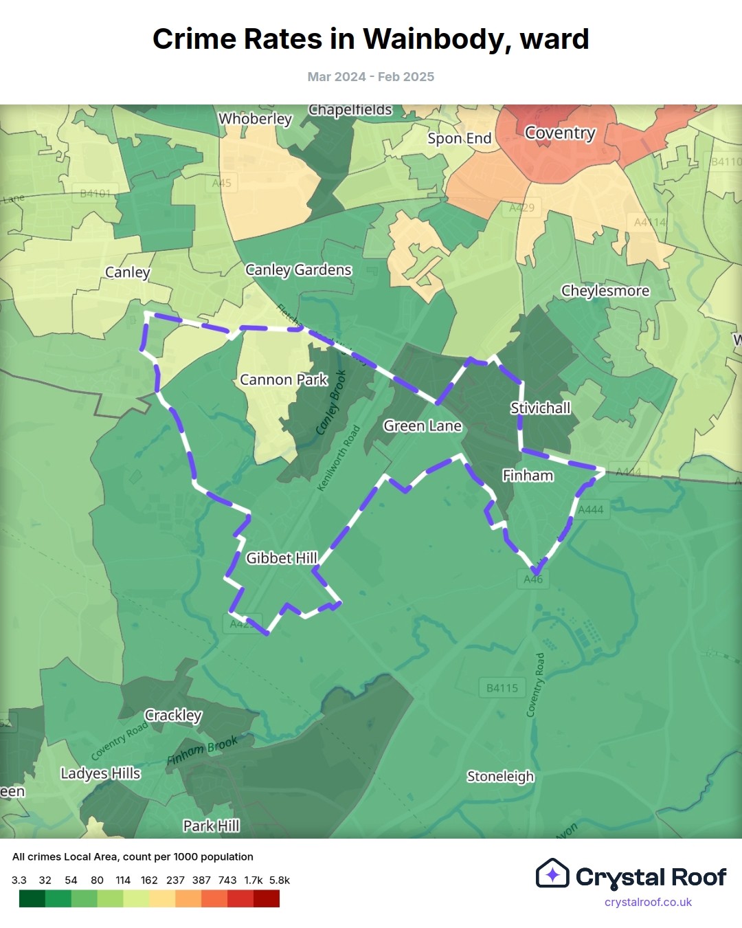 Wainbody (ward) is located within Coventry (borough). Annual total crime rate in Coventry (borough) is 108 crimes per thousand resident population, which can be rated as 5 out of 10 or medium crime level compared to other local authority districts in England and Wales.