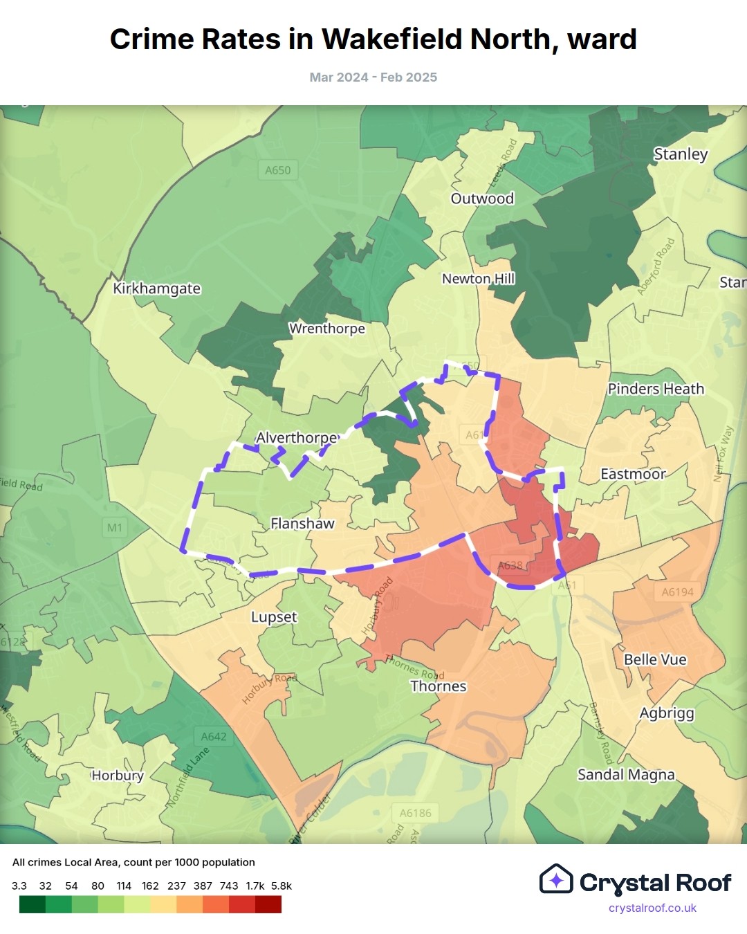 Wakefield North, (ward) includes areas with the following crime ratings (see map):