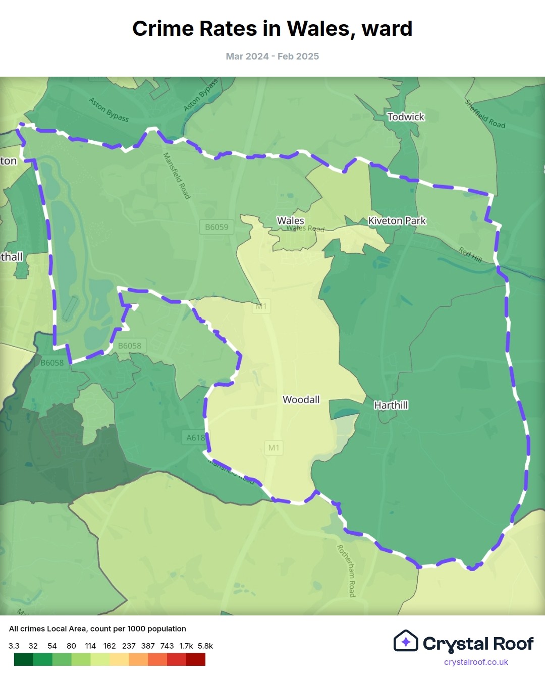 Wales (ward) is located within Rotherham (borough). Annual total crime rate in Rotherham (borough) is 109 crimes per thousand resident population, which can be rated as 5 out of 10 or medium crime level compared to other local authority districts in England and Wales.