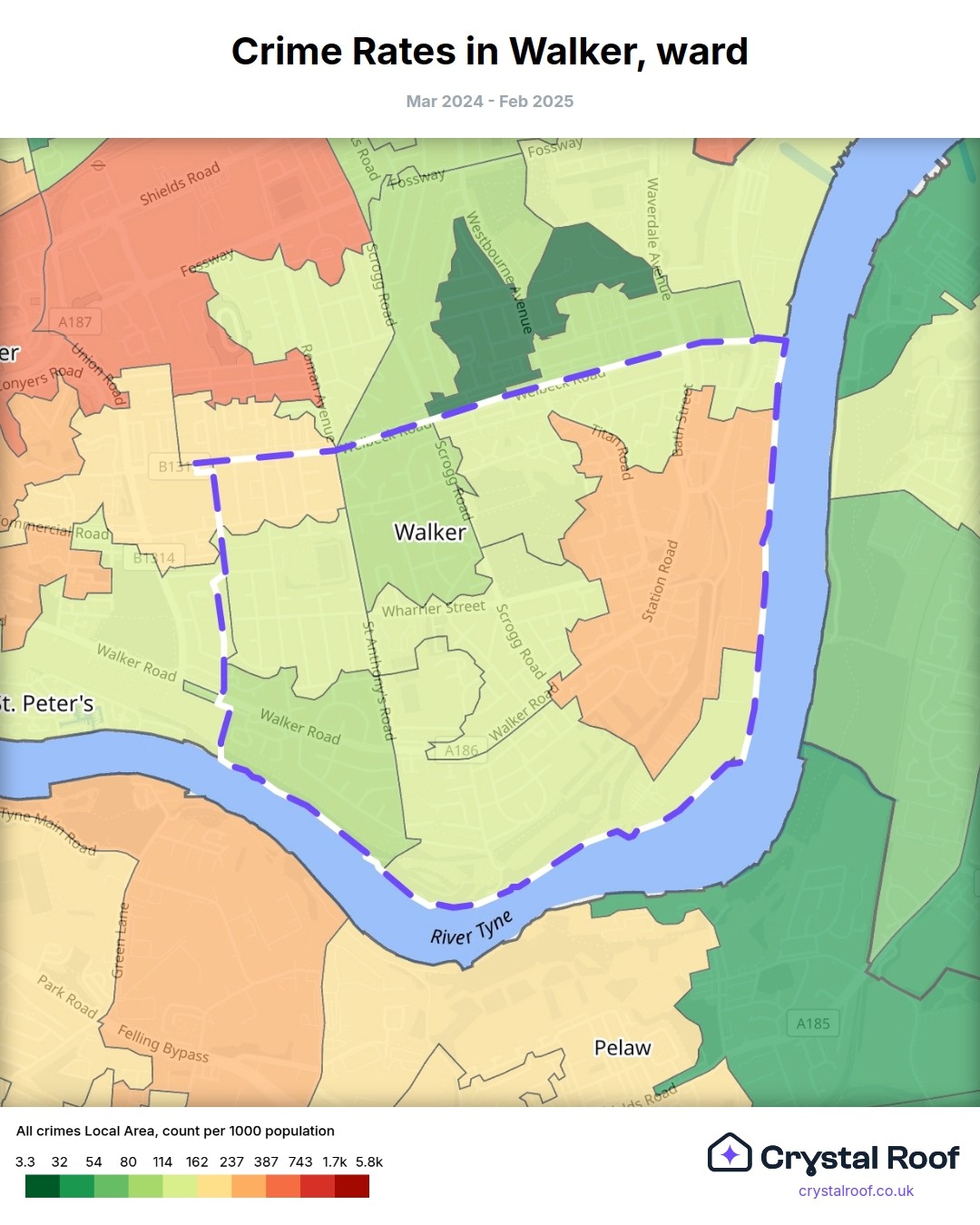 Walker (ward) is located within Newcastle upon Tyne (borough). Annual total crime rate in Newcastle upon Tyne (borough) is 148 crimes per thousand resident population, which can be rated as 7 out of 10 or high crime level compared to other local authority districts in England and Wales.