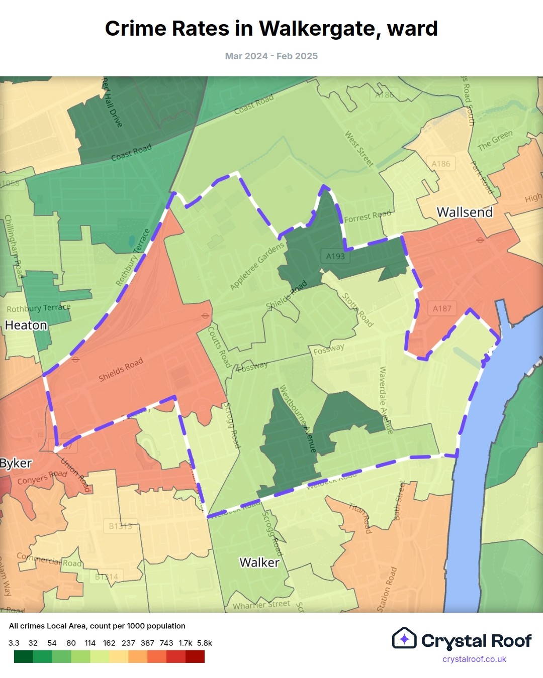 Walkergate, (ward) includes areas with the following crime ratings (see map):