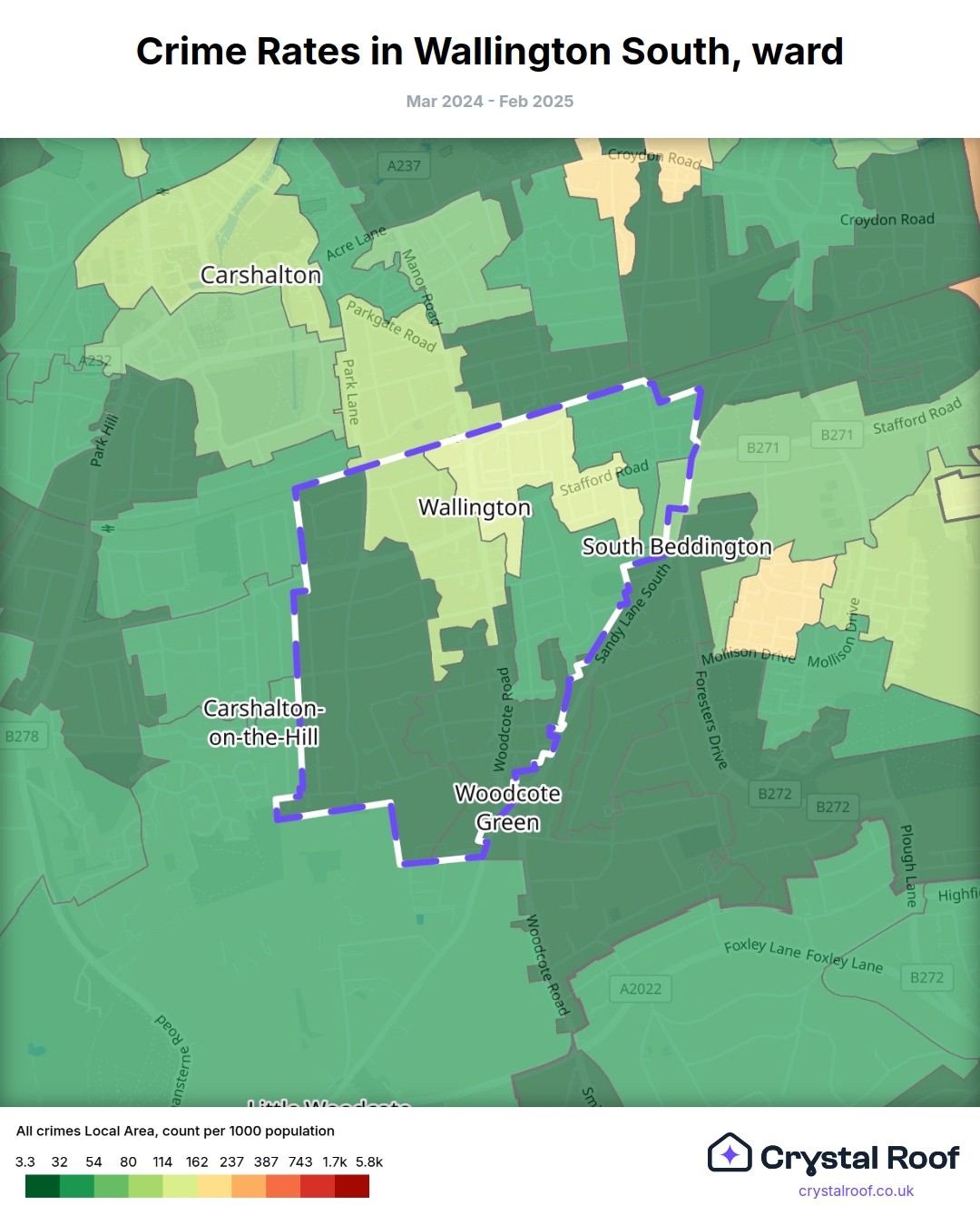 Wallington South, (ward) includes areas with the following crime ratings (see map):
