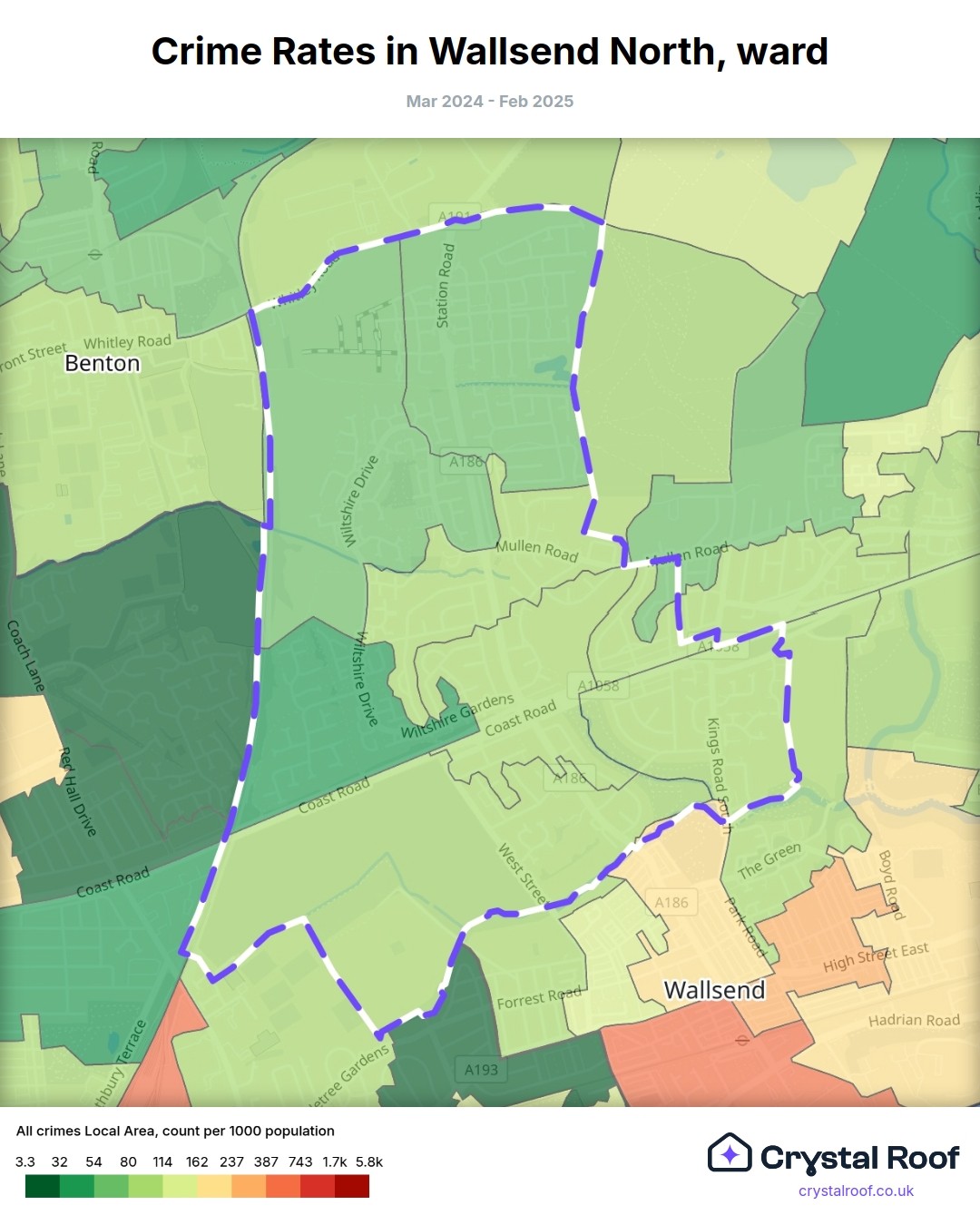 Wallsend North, (ward) includes areas with the following crime ratings (see map):